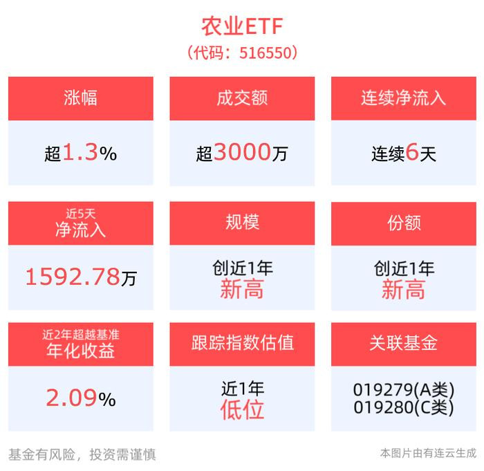 没有股票账户的场外投资者还可以通过农业ETF联接基金(019279)布局农业产业链投资机遇。